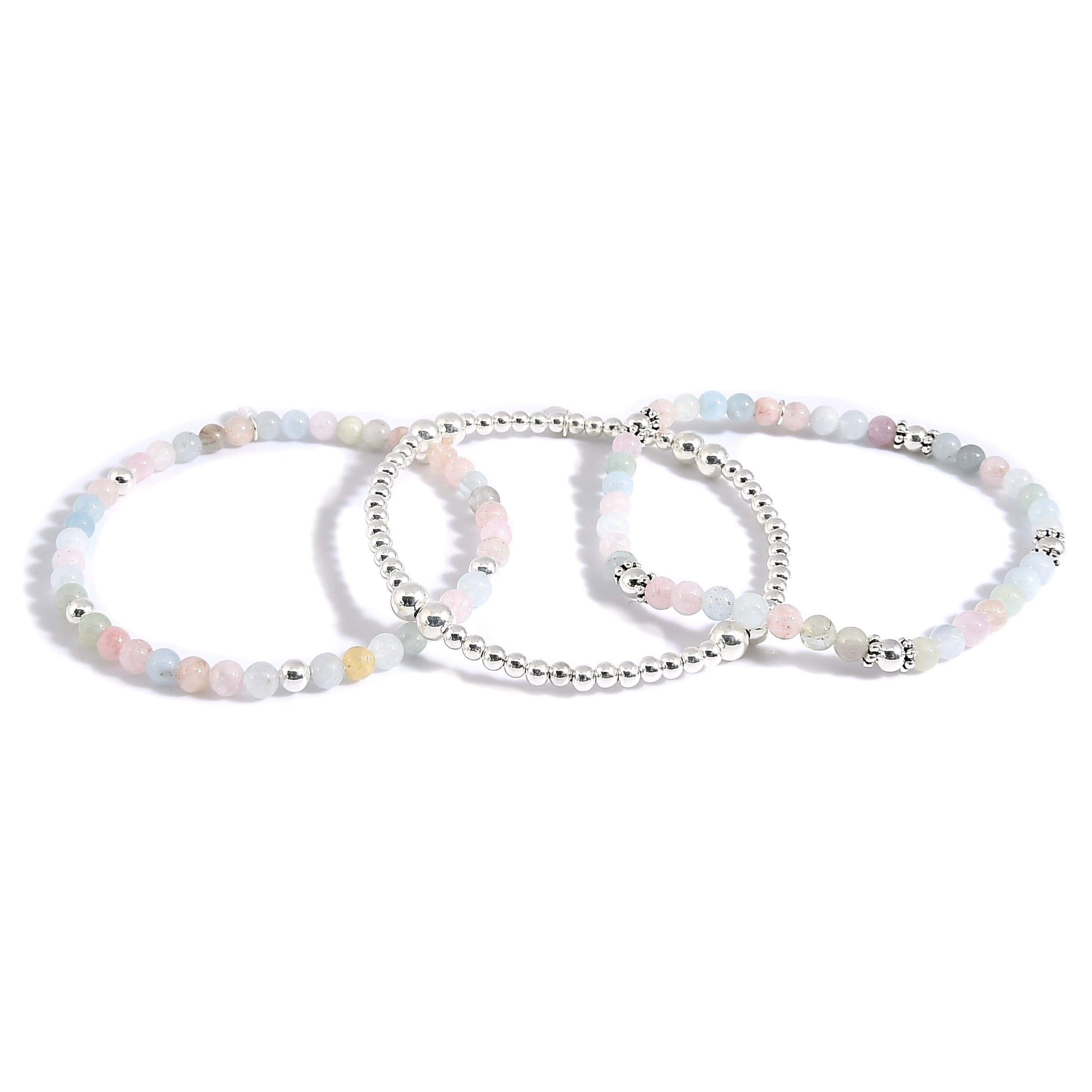 Dieses stilvolle 3er-Set vereint zwei traumhaft schöne Morganit-Armbänder mit einem edlen Bracelet aus reinem 925 Sterling Silber. Die sanften Rosé- und Pastelltöne des Morganits strahlen feminine Leichtigkeit aus, während das Silberarmband für klassische Eleganz sorgt.