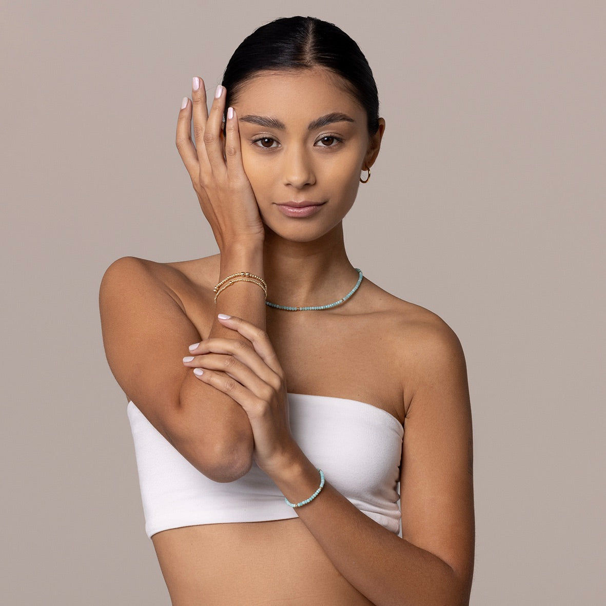 Dieses exquisite Damenarmband vereint geschliffene Amazonit- und Aquamarin-Steine, deren sanfte, natürlichen Farben von edlen 14 Karat Echtgold - Perlen perfekt ergänzt werden. Die Kombination aus den beruhigenden Blau- und Grüntönen der Edelsteine und dem luxuriösen Gold verleiht dem Armband eine unverwechselbare Reinheit und Eleganz.